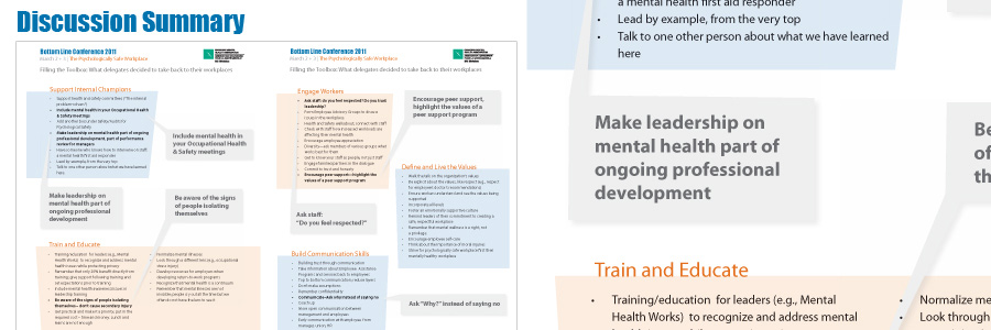 At the Bottom Line Conference, delegates participated in discussions on mentally safe workplaces. Hundreds of ideas and comments where categorized and laid out in an easy to read summary for available online. Page 1 of discussions summary.
