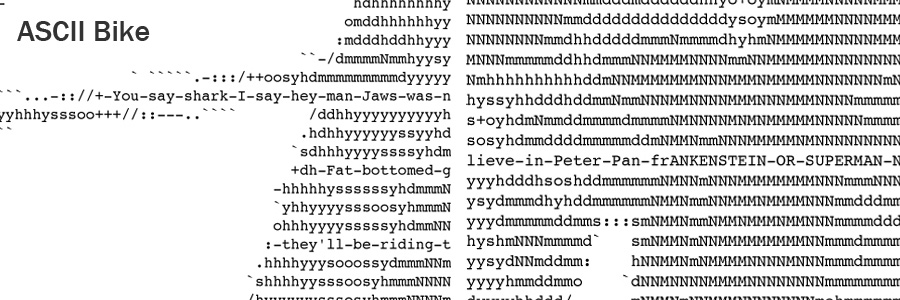 Ascii Bike (2010) was a tiled installation of over 100 letter-sized sheets of paper. The lyrics for Queen's "Bicycle Race" was embedded in the ascii image of my bike.