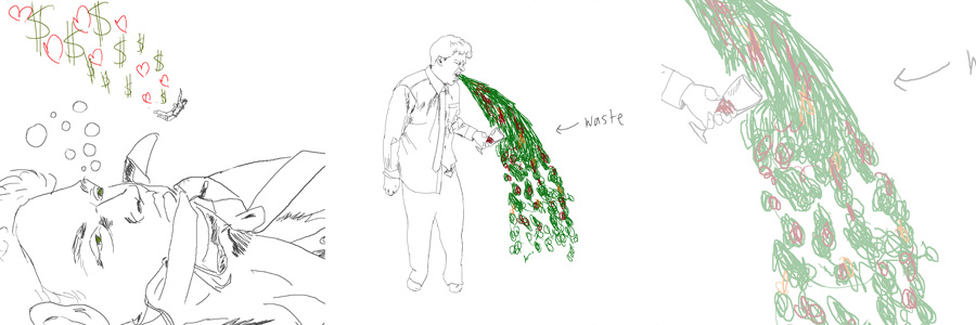 Excess (2009) A narrative series of tablet drawings printed on letter sized paper, revealing its original digital medium. Four drawings were composed regarding four open themes: Mega, Indulgence, Waste, Man-made and Amass.