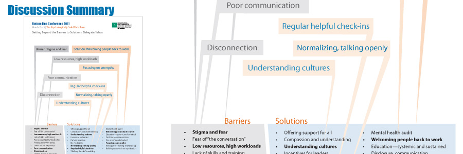 At the Bottom Line Conference, delegates participated in discussions on mentally safe workplaces. Hundreds of ideas and comments where categorized and laid out in an easy to read summary for available online. Page 1 of discussions summary.
